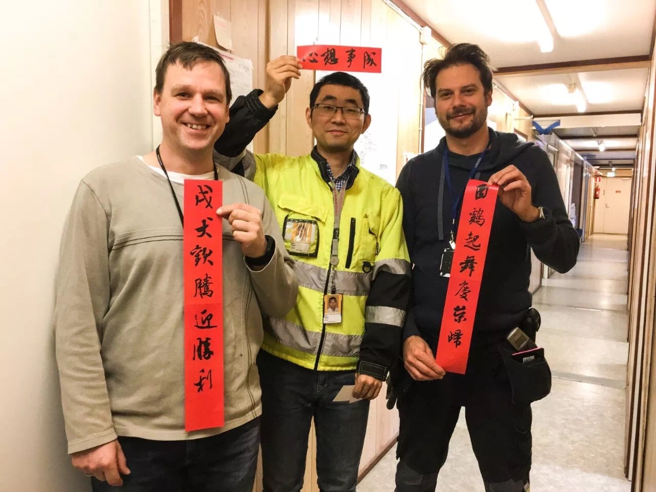 除夕當(dāng)天,他們?yōu)橥瑯訆^戰(zhàn)在芬蘭核電現(xiàn)場的國際同仁送去來自中國春節(jié)的祝福。自制的福字與春聯(lián)為2018的芬蘭項(xiàng)目增添了一份喜慶,一聲祝福,一抹中國紅,老外對(duì)上面的書法與內(nèi)容頗感興趣,但感嘆漢字太過復(fù)雜表示完全看不懂,不過他們高興的接受了這份best wishes。每個(gè)人臉上掛著笑容互相道聲:“Happy Chinese New Year。”