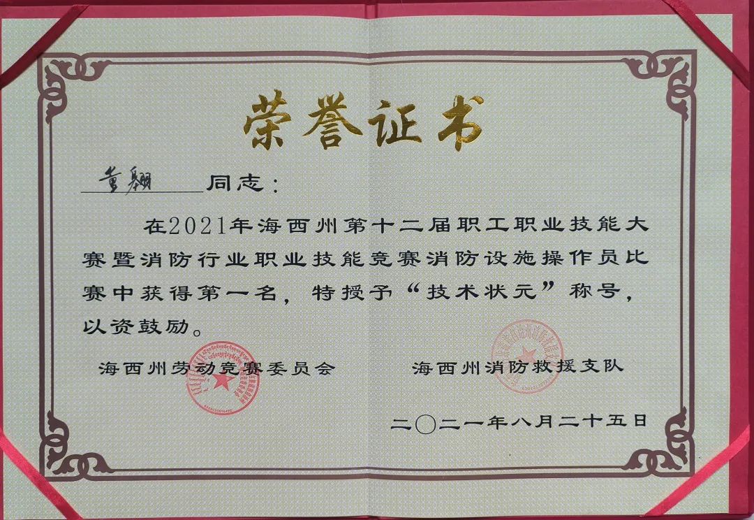 2021年8月,在海西州第十二屆職工職業(yè)技能大賽暨消防行業(yè)職業(yè)技能競(jìng)賽中,董翱獲得“消防設(shè)施操作員”比賽項(xiàng)目第一名,被授予“技術(shù)狀元”榮譽(yù)稱號(hào)。他代表海西州參加青海首屆消防行業(yè)職業(yè)技能競(jìng)賽,在比賽中獲得全省第6名,最終被青海省消防救援總隊(duì)選拔成為首屆全國(guó)消防行業(yè)職業(yè)技能大賽青海代表隊(duì)的唯一備賽人選。