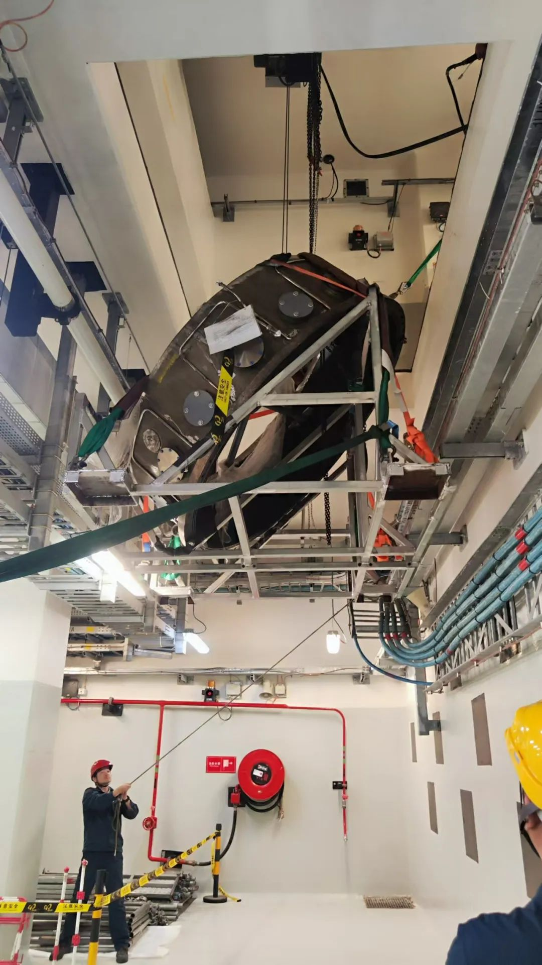 ▲正在引入探測器的不銹鋼罐體,這是整個設備引入過程中最難的一步
