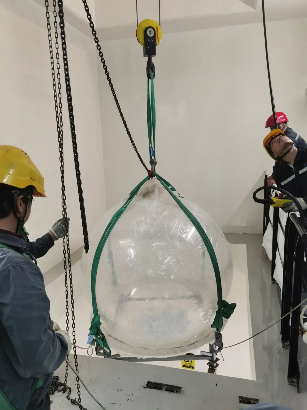 ▲正在引入有機玻璃球,將用于盛裝捕捉中微子用的神秘液體“液閃”