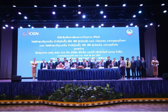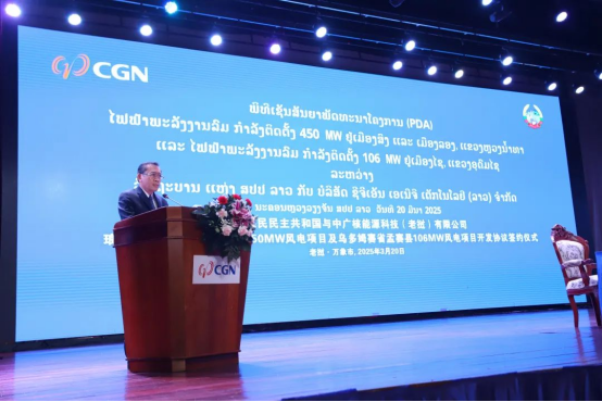 老撾當(dāng)?shù)貢r間3月20日,中廣核能源科技(老撾)有限公司與老撾政府在萬象簽署《老撾北部互聯(lián)互通清潔能源基地二期556MW風(fēng)電項目開發(fā)協(xié)議(PDA)》。老撾人民革命黨中央政治局委員、建國陣線中央委員會主席辛拉馮,老撾能礦部部長坡賽·賽雅頌,中國駐老撾大使館公參王暢等出席簽約活動。