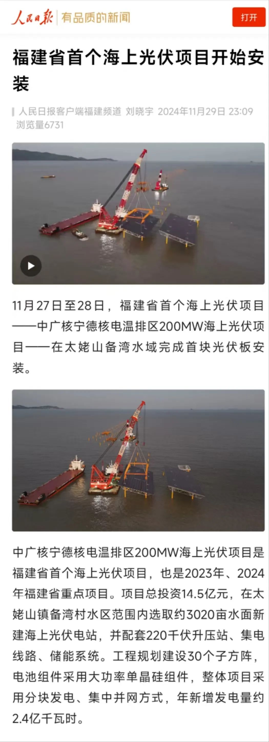 在太姥山備灣水域完成首塊光伏板安裝